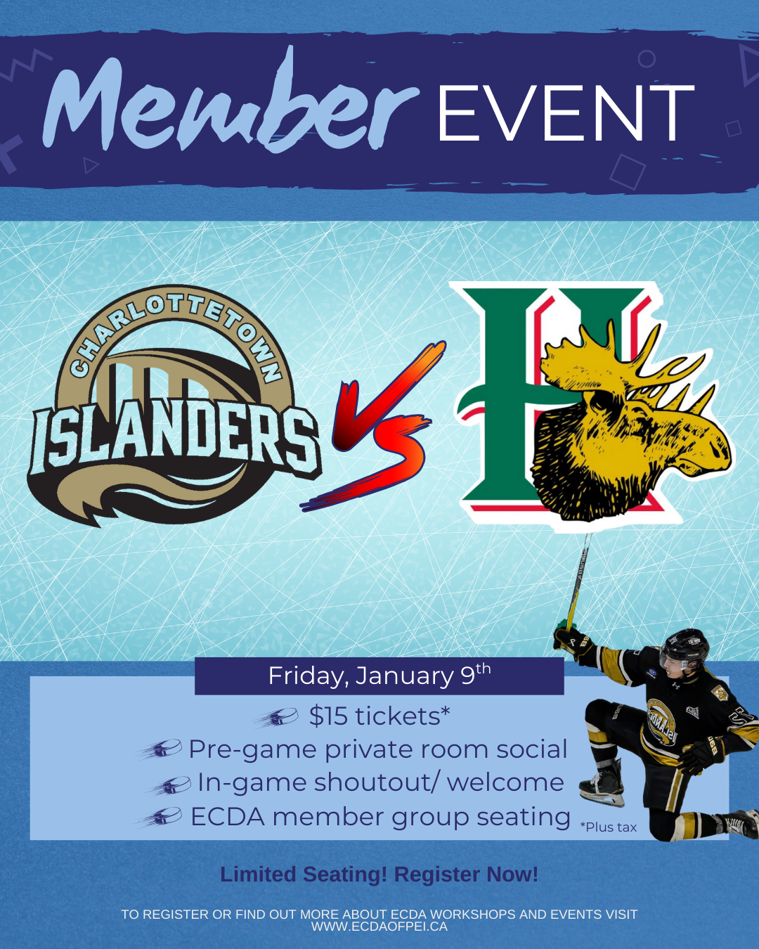 Back by popular demand! The Charlottetown Islanders are showing their appreciation for PEI’s Early Learning and Child Care sector by inviting ECDA members to their Friday, January 9th game vs. the Halifax Mooseheads! This marks the second year of this wonderful collaboration, and we can't wait to celebrate and cheer together!