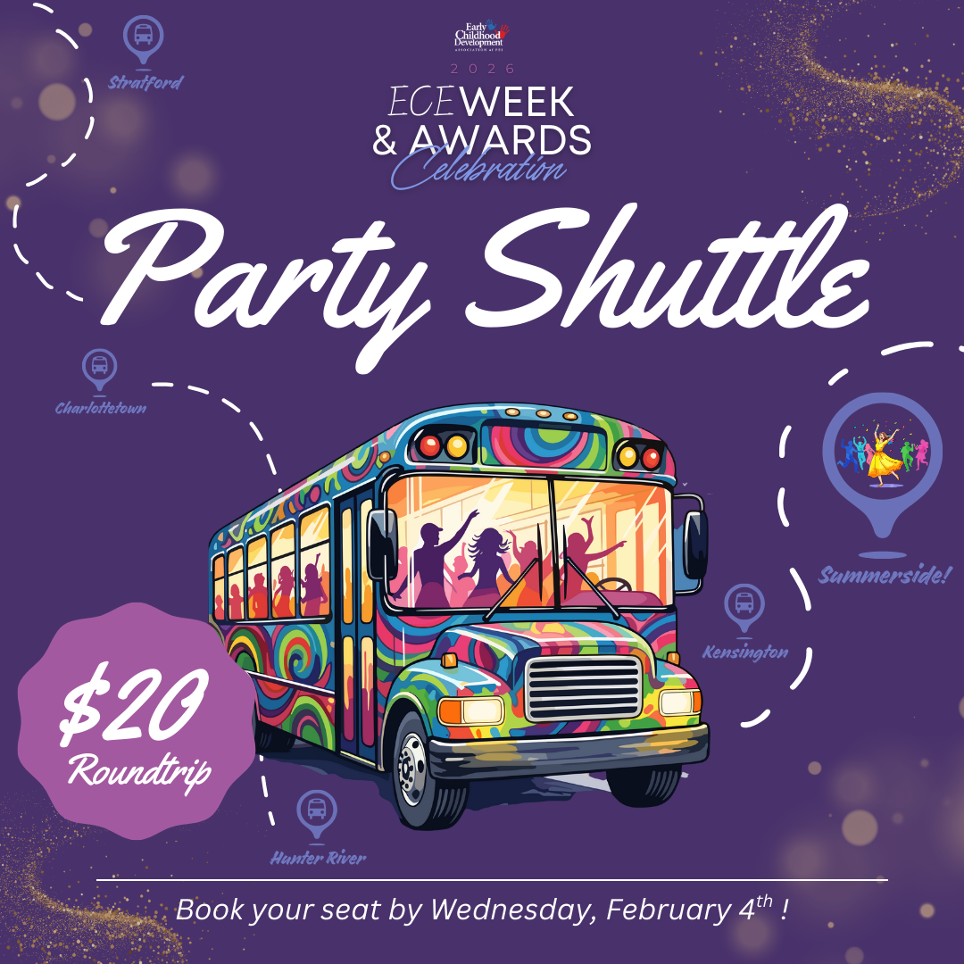 We are excited to offer a Party Shuttle for the ECE Week & Award Celebration on Saturday, February 7th, transporting members from Stratford to the Credit Union Place in Summerside, with pick-up and drop-off stops in Charlottetown, Hunter River, and Kensington.